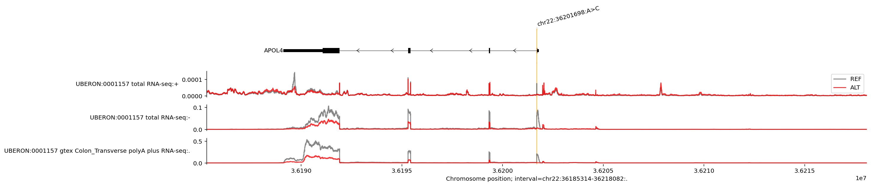 | 4 | chr22:36201698:A>C | chr22:35677410-36725986:. | ENSG00000100320 | RBFOX2 | protein_coding | - | None | None | RNA_SEQ | GeneMaskLFCScorer(requested_output=RNA_SEQ) | CL:0000115 total RNA-seq | - | total RNA-seq | CL:0000115 | endothelial cell | in_vitro_differentiated_cells | 0.000349 | 3.831612e-01 | |