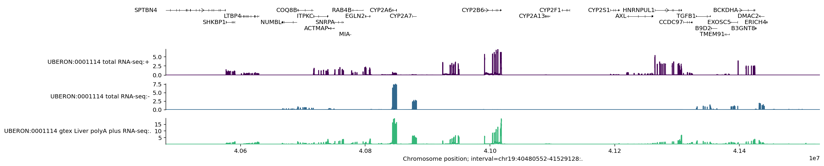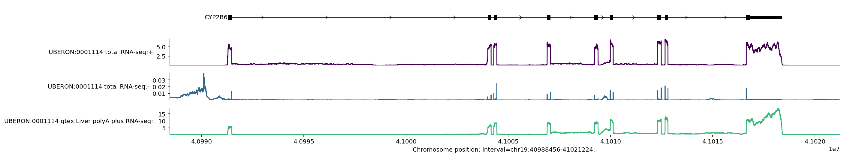 For convenience, you can also directly make predictions for a human reference genome sequence specified by a genomic interval. For example, let’s predict RNA-seq for tissue ‘Right liver lobe’ in a 1MB region of Chromosome 19 around the gene CYP2B6, which encodes an enzyme involved in drug metabolism, and is primarily expressed in the liver.