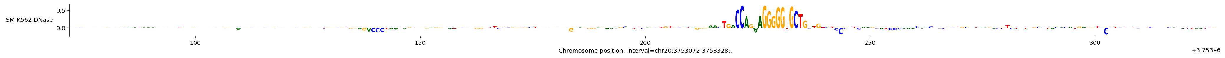 This plot shows that the sequence between positions ~225 to ~240 has the strongest effect on predicted nearby DNAse in K562 cells.