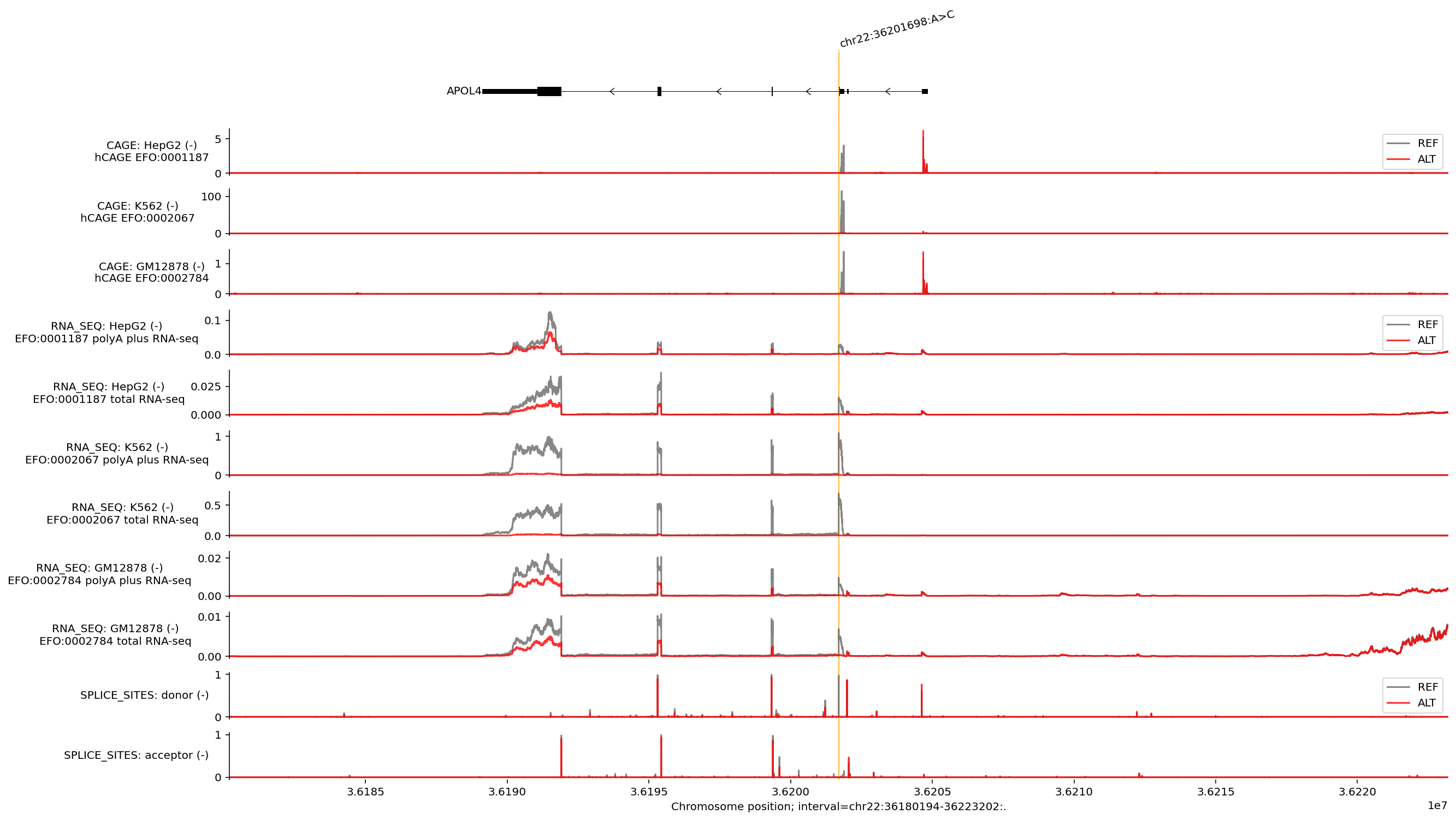 # @markdown We can also visualise the predicted effects of the variant by first predicting tracks for the REF and ALT alleles: